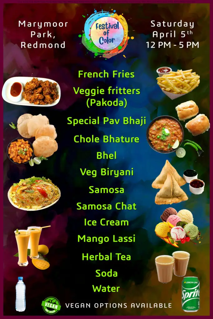 Food at Festival of Colors would taste regional cuisines native to India. Given the range of diversity in soil type, climate, culture, ethnic group and occupations, these cuisines vary significantly from each other and use locally available spices, herbs, vegetables and fruits. Indian food is also heavily influenced by religious and cultural choices and traditions. Come and enjoy following Indian delicacies. We are serving French Fries, Pakora and Dum Biryani.